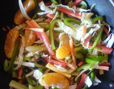 • Toss together the veggies with the jalepenos, olives and orange slivers.